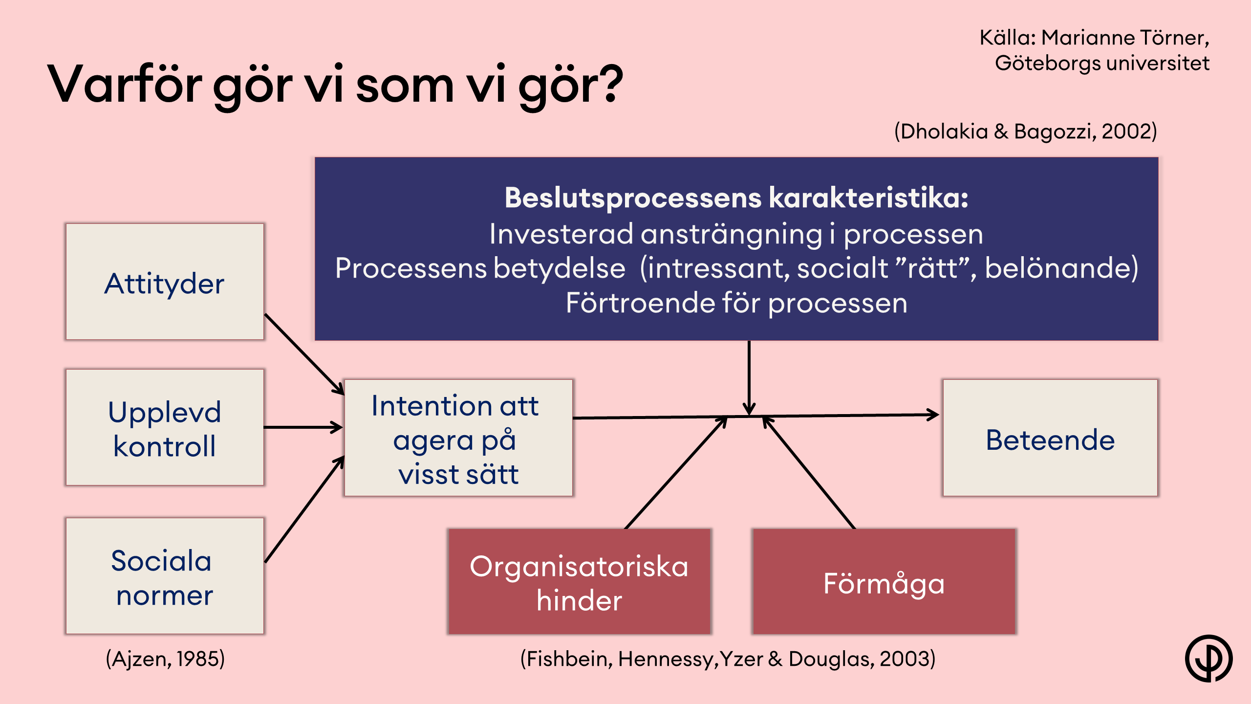 Vår intention att agera på ett visst sätt påverkas av attityder, upplevd kontroll och sociala normer. Huruvida vi sedan agerar i linje med intentionen påverkas av den egna förmågan och eventuella organisatoriska hinder – man kanske inte har möjlighet att utföra ett jobb i tid om man ska agera på ett säkert sätt. Det styrs också av hur mycket ansträngning man investerat i beslutsprocessen och om man upplever ett visst agerande som viktigt och har förtroende för processen som lett fram till beslutet.